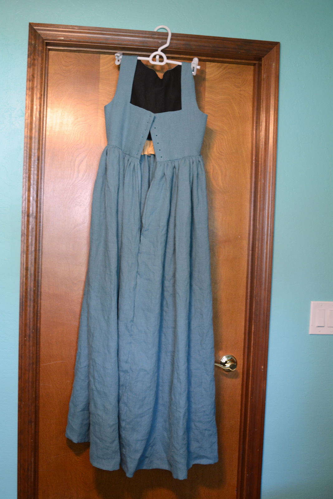 Made from 100% linen and a cotton canvas interlining for the bodice. This layer is mostly handsewn including the eyelets. The outer fabric and lining of the bodice were sewn to the interlining by hand. Both the bodice and skirt were assembled by hand. The skirt was hemmed and sewn to the bodice by hand. The sleeves were constructed entirely by hand. The only steps that were completed on the machine are the boning channels and assembling and attaching the skirt facing. It is lightly boned with 6 steel bones.