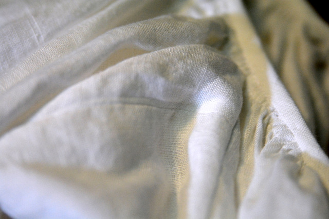 Made from 100% linen mostly by machine. The sleeve and bottom hems were sewn by hand. The seams were finished by serging so I can wash it by machine.